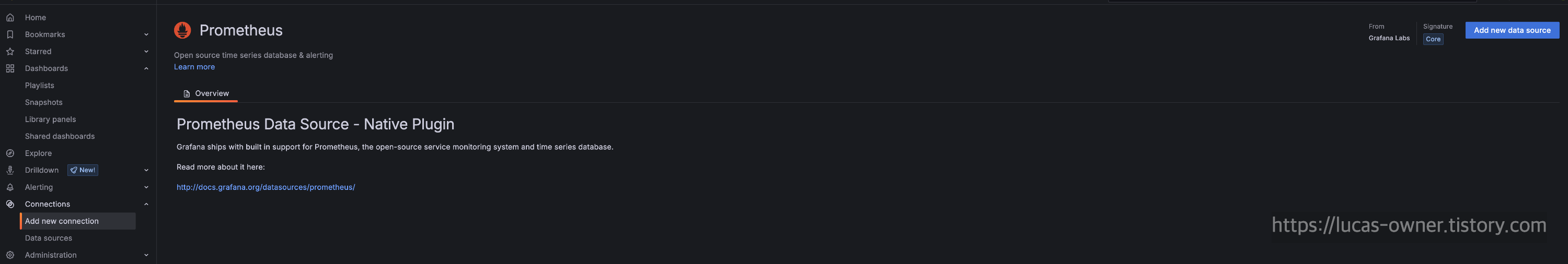 우선 Data source 를 Prometheus 로 지정해야하며, Running 중인 프로메테우스의 IP:port 로 설정하도록 하자.